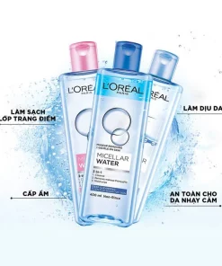 - L’Oréal Paris Micellar Water 3-in-1 Deep Cleansing Even For Sensitive Skin (xanh dương đậm): làm sạch sâu lớp trang điểm hiệu quả, kể cả lớp trang điểm lâu trôi và không thấm nước. Thích hợp cho mọi loại da, kể cả da nhạy cảm.