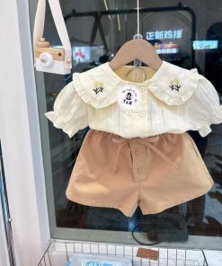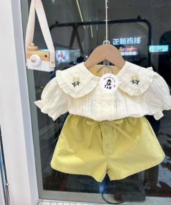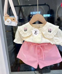 - Đặc điểm: Áo cộc tay, 1 hàng cúc thật giúp bé dễ mặc, cổ sen, họa tiết thêu (không phải in). Quần chun cạp to, thoải mái, đính nơ, cúc giả.